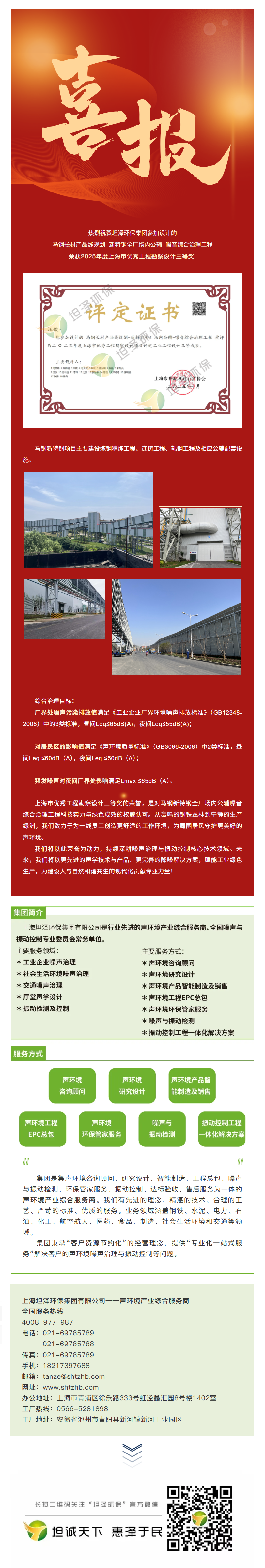 上海坦泽环保集团有限公司是行业先进的声环境产业综合服务商。主要服务包括:工业企业噪声治理、社会生活环境噪声治理、交通噪声治理、厅堂声学设计、振动监测及控制;为客户提供声环境咨询顾问、声环境研究设计 、声环境产品智能制造及销售、声环境工程EPC总包、声环境与振动检测、声环境环保管家、振动控制工程一体化解决方案。